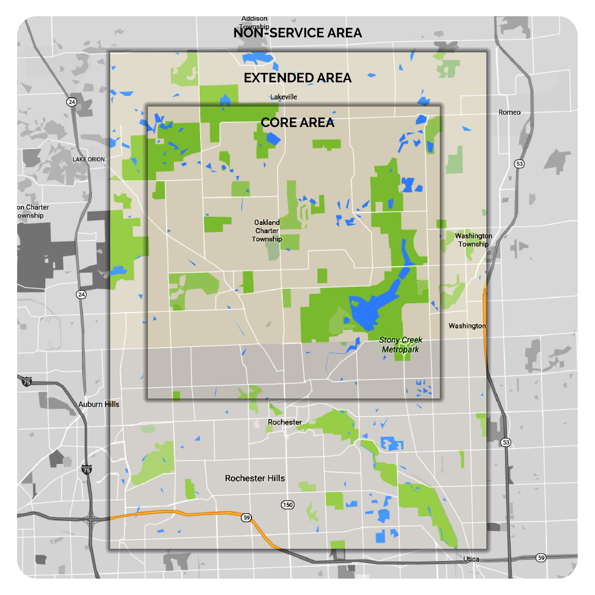 This map is intended to give a rough idea of our service area and is more of a guideline than an actual rule.